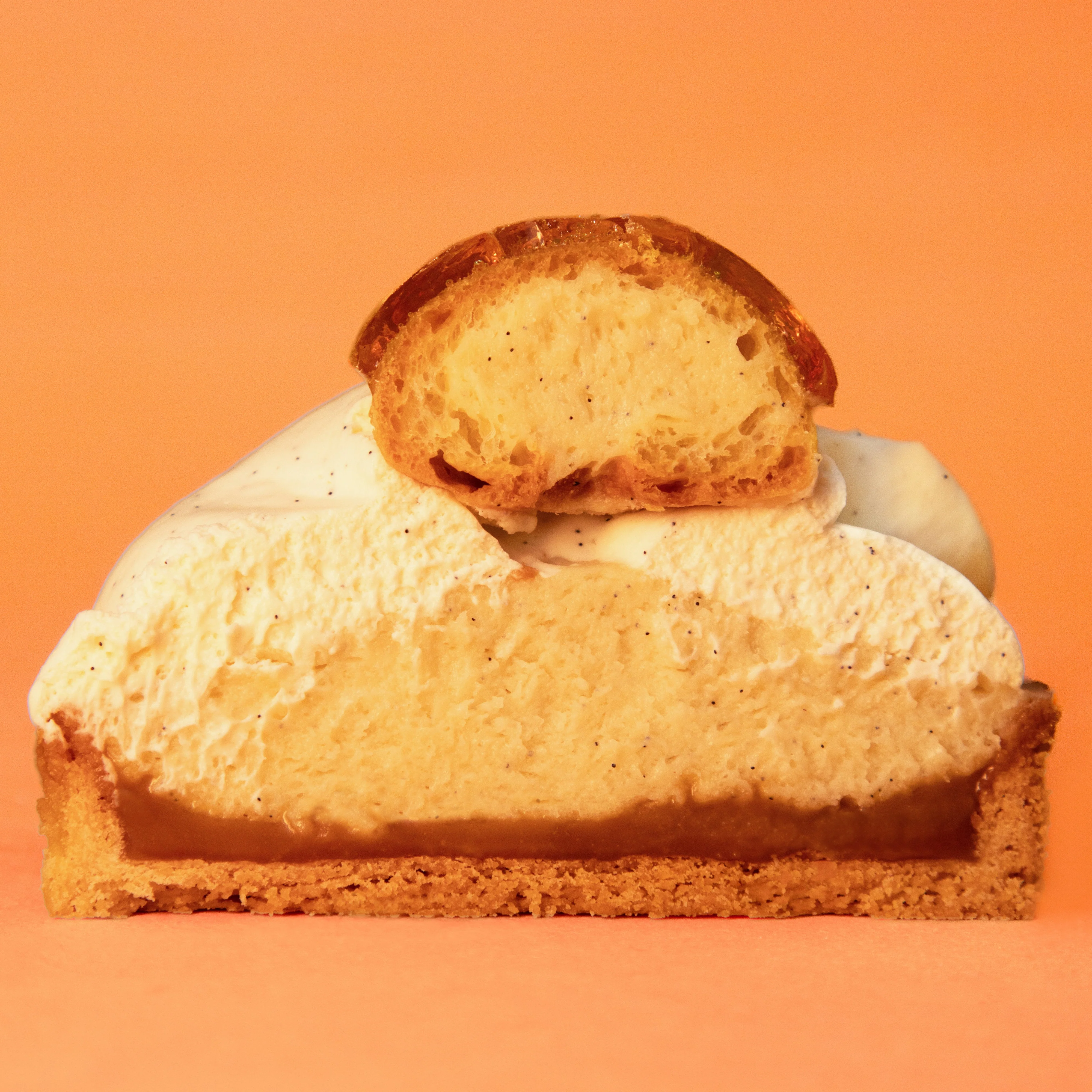Une crème pâtissière légère et onctueuse, un caramel à la fleur de sel et un choux caramélisé gourmand.